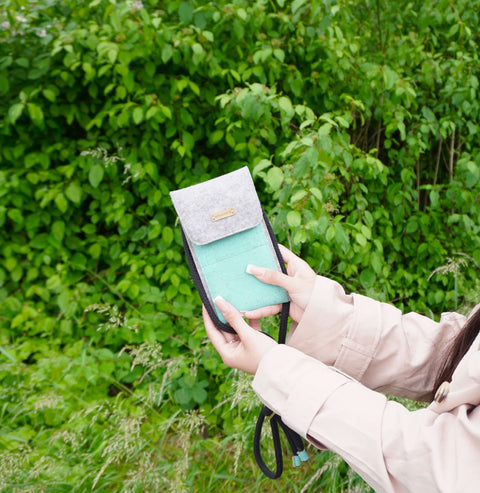 Hand, die die Innentasche einer handgefertigten Handytasche aus Filz und Baumwolle in Hellgrau und Azurblau präsentiert.