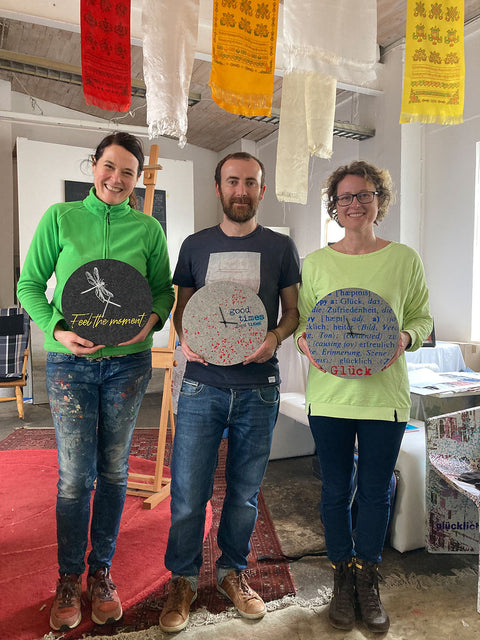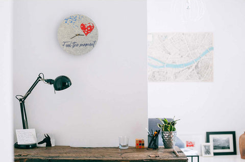 Onze vilten wandklokken, bedrukt door Anja Streese, creëren een heel bijzondere sfeer bij het wonen en werken. Met de hand gedrukt via een zeefdrukproces door de Trierse kunstenaar Anja Streese.
